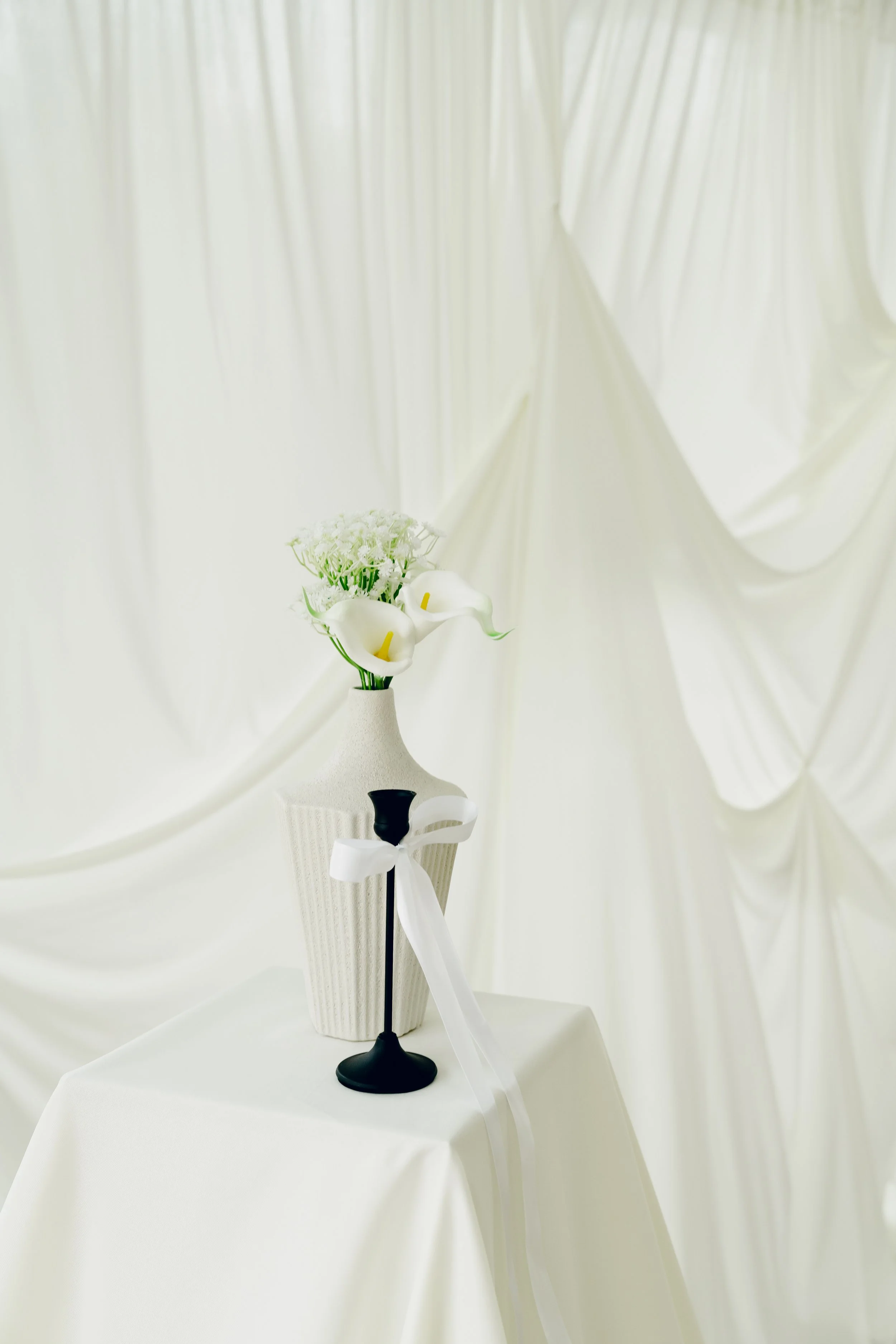 They chose a timeless black-and-white color palette that felt clean yet romantic. To bring in softness and sophistication, we used delicate draping throughout the space. Alisha also had a clear floral vision and wanted the space to be filled with beautiful calla lilies, and that’s exactly what we did. The elegant white blooms added a sculptural grace to the décor, perfectly complementing the minimal tablescapes and romantic ambiance.